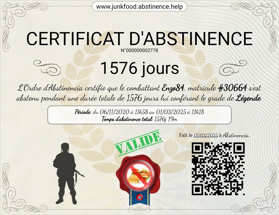 Soit un total de 52 jours de no fast foodNew rank achieved: Caporal-chef - J9 10 jours de no fast food facile + 35 jours en réalité = 45 jours de no fast food je me suis détaché de cet addiction !